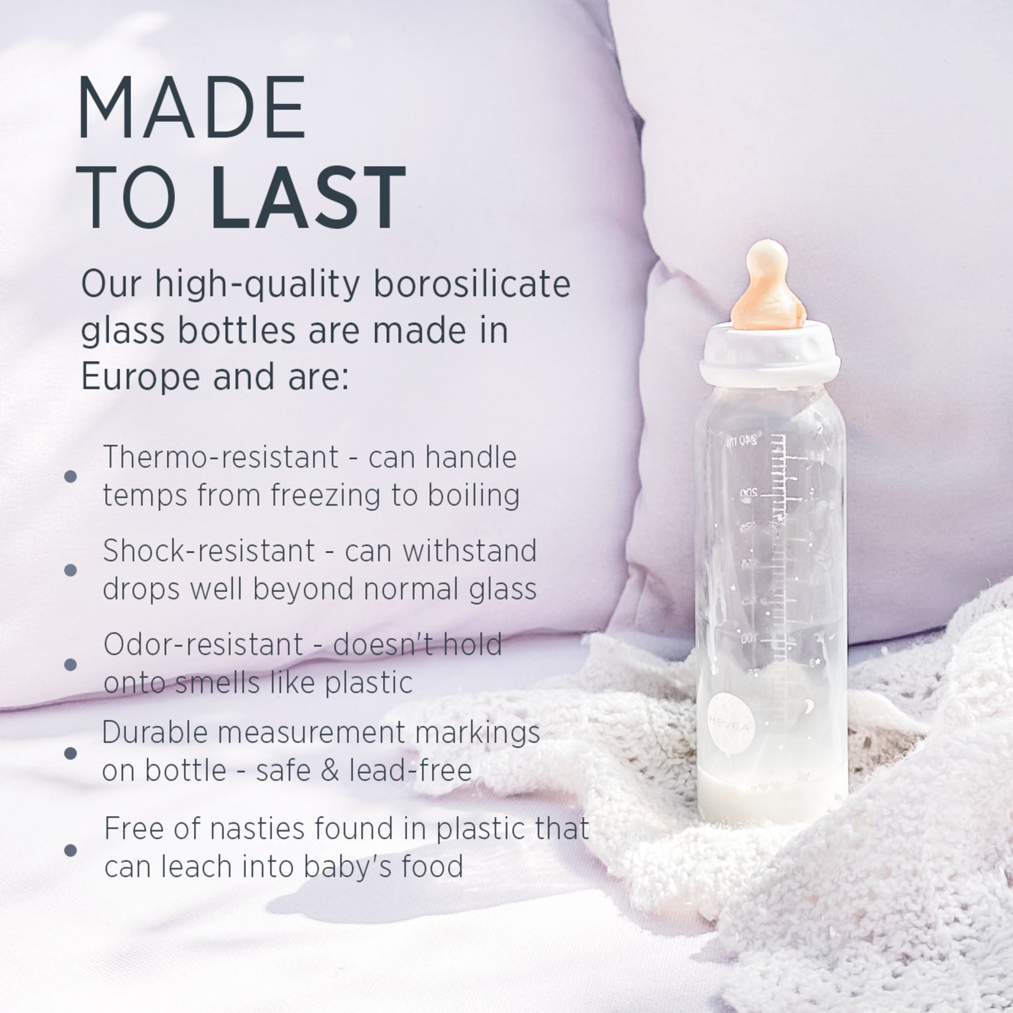 TRUSTED BY PARENTS TO BE NATURAL AND SAFE – HEVEA baby glass bottles are made from the highest quality materials for your baby! They are free of BPA, PVC, and Phthalates, and other harmful materials that can leach from plastic bottles. Our nipples are made from 100% natural rubber, and our bottle from shock and thermo-resistant borosilicate glass. Our screw thread and dust cap are made from the high-quality polypropylene